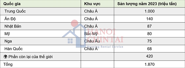 Theo đó, dẫn đầu là Trung Quốc với sản lượng 1 tỷ tấn trong năm 2023, chiếm hơn 50% sản lượng toàn cầu. Những năm gần đây, ngành thép toàn cầu đang đối mặt một vấn đề lớn là tình trạng dư thừa công suất ở Trung Quốc. Sản lượng thép của nước này luôn cao hơn nhu cầu, gây áp lực giảm giá và ảnh hưởng tới lợi nhuận của các nhà sản xuất thép trên thế giới.