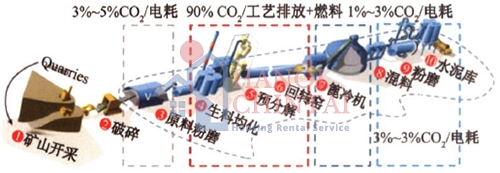 Theo quy trình sản xuất xi măng phổ biến hiện nay, lượng khí thải carbon dioxide chủ yếu đến từ quá trình đốt cháy nhiên liệu và sản xuất clinker. Hai quá trình phân hủy sơ bộ nguyên liệu thô và nung trong lò quay trong quá trình sản xuất chiếm khoảng 90% lượng khí thải carbon.