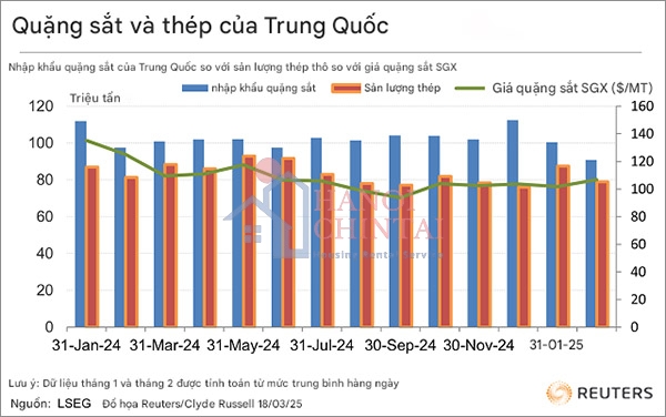 Theo Cục Thống kê Quốc gia Trung Quốc, đầu tư bất động sản giảm 9,8%, doanh số bán hàng giảm 5,1%, trong khi các dự án khởi công mới lao dốc 29,6% so với cùng kỳ năm trước. Giá nhà mới cũng giảm 4,8% trong tháng 2, phản ánh sự trì trệ của lĩnh vực bất động sản - vốn là trụ cột tiêu thụ thép. Hệ quả là thị trường quặng sắt chịu áp lực mạnh, với giá hợp đồng tương lai tại Singapore giảm 1,1% xuống 102,65 USD/tấn, còn hợp đồng chuẩn trên sàn Đại Liên giảm 6,6% so với mức cao nhất năm nay.