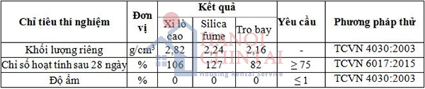 Bảng 1. Tính chất cơ lý của Xỉ lò cao (SL); Silica Fume (SF); Trobay (FA)