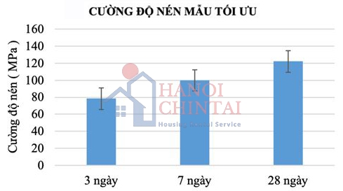 Nhận xét: Cường độ nén của cấp phối tăng dần qua các mốc thời gian 3, 7 và 28 ngày. Ở mốc thời gian 3 ngày cấp phối M đạt cường độ nén là 78,4 ± 1,8 MPa; ở 7 ngày tuổi cường độ đã tăng lên 99,8 ± 1,4 MPa và ở 28 ngày thì cường độ là 121,9 ± 0.9 MPa.