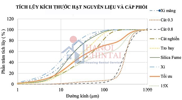 Nhận xét: Dựa vào biểu đồ đường và kết quả nhiễu xạ kích thước hạt laser ta nhận thấy kích thước hạt của xỉ lò cao là nhỏ nhất (Dtb=17,96 µm), sau đó đến xi măng (Dtb=22,70 µm), Silica Fume (Dtb=27,22 µm), tro bay (Dtb=37,05 µm), cát nghiền (Dtb=53,98 µm), cát 0,3 (Dtb=306,00 µm) và cuối cùng cát 0,8 (Dtb=309,56 µm) cho kích thước hạt cao nhất. Cỡ hạt phân bố đều từ nhỏ đến lớn tạo độ xít chặc trong cấu trúc, giảm độ rỗng trong hỗn hợp.