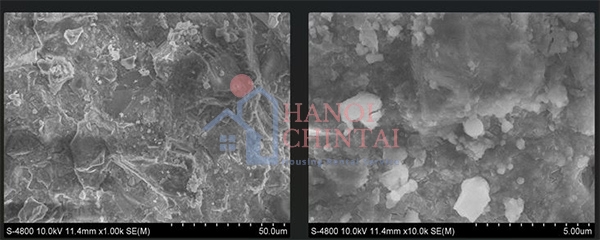 Hình 3: Ảnh SEM của cấp phối M ở độ phóng đại 1000 và 10.000 lần.