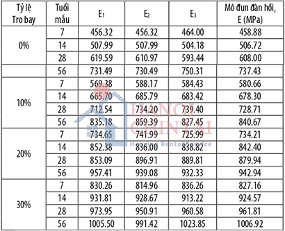 Kết quả về mô đun đàn hồi (E) ở tuổi 7, 14, 28, 56 ngày được thể hiện ở Bảng 6.
