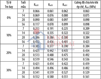 Kết quả về cường độ chịu kéo khi ép chẻ (Rech) ở tuổi 7, 14, 28, 56 ngày được thể hiện ở Bảng 5.