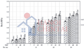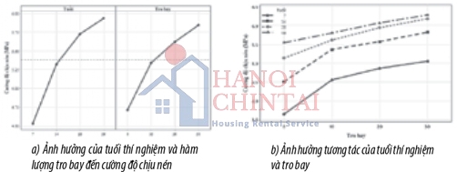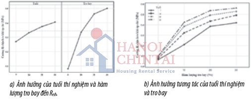 Hình 7 cho thấy sự ảnh hưởng của hàm lượng tro bay và tuổi ngày thí nghiệm đến cường độ chịu nén. Cả hàm lượng tro bay sử dụng và tuổi thí nghiệm đều có những ảnh hưởng nhất định đến cường độ chịu nén của cấp phối xỉ thép gia cố xi măng - tro bay.