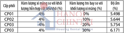 Bốn loại cấp cấp phối xỉ thép gia cố CP01, CP02, CP03, CP04 với hàm lượng xi măng là 4% và lượng tro bay lần lượt là 0%, 10%, 20% và 30% so với khối lượng của xi măng được thiết lập để nghiên cứu.