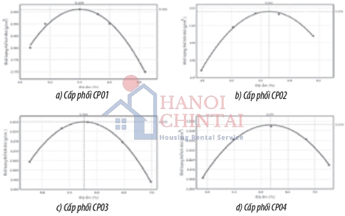 Để có thể chế tạo mẫu gia cố, cần xác định độ ẩm hợp lý và khối lượng thế tích lớn nhất theo phương pháp II-D trong TCVN 12790:2020 [25] của các cấp phối CP01, CP02, CP03, CP04. Kết quả được trình bày ở Hình 2.