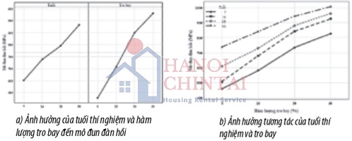 Tương tự như chỉ tiêu cường độ chịu nén và cường độ chịu kéo khi ép chẻ, mô đun đàn hồi của cấp phối xỉ thép gia cố xi măng - tro bay được phân tích ở Hình 11. Kết quả cho thấy, ảnh hưởng của hàm lượng tro bay đến mô đun đàn hồi lớn hơn so với tuổi ngày thí nghiệm.
