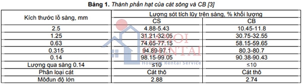 Qua kết quả lượng sót tích lũy trên sàng của CS và CB (Bảng 1) có thể phân loại cả hai loại cát trên đều thuộc cát thô, đồng thời kết quả thí nghiệm thành phần hạt của CS và CB nhận thấy thành phần hạt của hai vật liệu trên là khá tương đồng và đáp ứng yêu cầu kỹ thuật đối với cát cho bê tông. Ngoài ra, từ kết quả phân tích theo TCVN 7572-4: 2006 [4] nhận được khối lượng thể tích của CS và CB tương ứng là 1510g/lít và 1457g/lít.