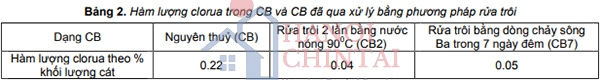 - Cát biển được rửa trôi bằng cách tận dụng dòng chảy sông Ba trong 7 ngày đêm để giảm hàm lượng clorua đến mức cho phép đối với bê tông). Theo đó, cát biển được đóng thành từng bao nhỏ với khối lượng 30 kg và ngâm trong dòng chảy sông Ba cách mép bờ 2 mét và cách cửa biển 2km, thời gian rửa vào tháng 3 (mùa khô) và vận tốc dòng chảy sông ước tính 0.6 m/s. Kết quả phân tích hàm lượng clorua trong CB theo TCVN 7572-15:2006 [5] được thể hiện trong Bảng 2.