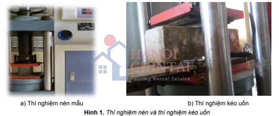 Sau khi đổ, các mẫu được bảo dưỡng trong 3 ngày, 7 ngày và 28 ngày tuân theo các tiêu chuẩn hiện hành. Sau thời gian bảo dưỡng đến các ngày tuổi dự kiến, các mẫu được thí nghiệm tại phòng thí nghiệm trường Đại học Xây dựng miền Trung. Mẫu lập phương được thí nghiệm trên máy nén có thang đo cực đại 100 tấn, mẫu lăng trụ để thí nghiệm kéo uốn được thí nghiệm trên máy nén có thang đo cực đại 20 tấn (Hình 1).