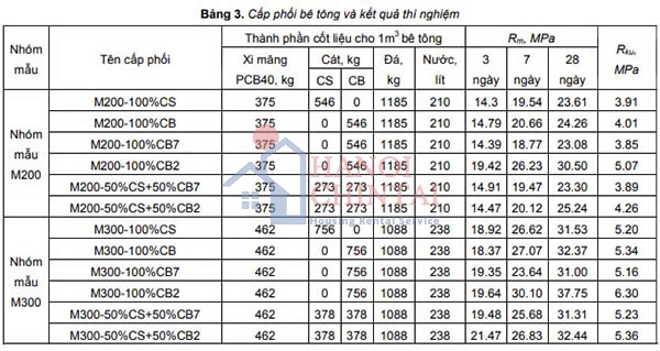 Trong nội dung bài báo này, tác giả tiến hành nghiên cứu sự phát triển cường độ chịu nén của bê tông qua 3 ngày, 7 ngày và 28 ngày tuổi và cường độ chịu kéo khi uốn của bê tông sử dụng CB để thay thế CS. Nghiên cứu thực nghiệm được tiến hành dựa trên 2 cấp phối bê tông chuẩn sử dụng CS với mác bê tông dự kiến là M200 (Nhóm mẫu M200) và M300 (Nhóm mẫu M300), độ sụt dự kiến 12 cm. Từ các cấp phối bê tông chuẩn tiến hành thay thế CS bằng CB với tỉ lệ lần lượt: 50% và 100%. Các cấp phối bê tông sử dụng trong nghiên cứu được thể hiện chi tiết trong Bảng 3. Cường độ chịu nén của mỗi cấp phối được xác định dựa vào kết quả thí nghiệm 05 mẫu lập phương 150×150×150 mm theo TCVN 3118:1993 [1], cường độ chịu kéo uốn của mỗi cấp phối được xác định dựa vào kết quả thí nghiệm 05 mẫu lăng trụ 150×150×600 mm theo TCVN 3119:1993 [2].