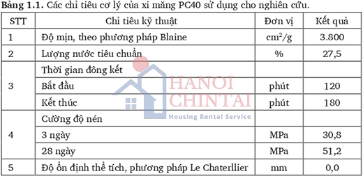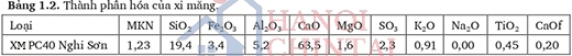 Đề tài sử dụng xi măng PC40 Nghi Sơn. Đây là loại xi măng portland phù hợp theo TCVN 2682:2009. Các chỉ tiêu cơ lý và hóa của xi măng PC40 Nghi Sơn sử dụng trong nghiên cứu được trình bày trong Bảng 1.1, Bảng 1.2 tương ứng.