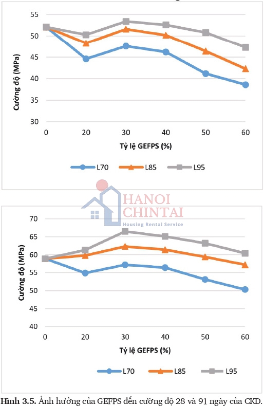 Kết quả thí nghiệm cho thấy, ở tuổi 3 ngày các mẫu xỉ đều có cường độ thấp hơn tương đối nhiều so với mẫu đối chứng, tuy nhiên đa số các mẫu đặc biệt là các mẫu sử dụng xỉ có độ mịn lớn hầu như đều có cường độ lớn hơn 18 MPa phù hợp với mức quy định tối thiểu với xi măng portland hỗn hợp PCB40 theo TCVN 6260:2020 và hoạt tính cường độ khi trộn với tỷ lệ 30% xỉ không bé hơn 50%, phù hợp với mức quy định tối thiểu của xỉ phốt pho nghiền mịn sử dụng cho xi măng và bê tông theo GB/T 26751:2011. Đến tuổi 7 ngày thì các mẫu xỉ vẫn có cường độ thấp hơn so với mẫu đối chứng, tuy nhiên mức độ giảm đã được thu hẹp đáng kể dao động chủ yếu trong khoảng 70 - 90%. Ở tuổi 28 ngày và 91 ngày, hầu hết các mẫu đều cho cường độ xấp xỉ bằng hoặc lớn hơn mẫu đối chứng, mức độ tăng phụ thuộc vào tỷ lệ xỉ nghiền, cơ bản cường độ đạt cao nhất ở tỷ lệ 30 - 40%, chỉ tiêu hoạt tính cường độ của các mẫu xỉ nghiên cứu phù hợp với mức quy định L70, L85 và L95 đối với xỉ phốt pho nghiền mịn dùng cho xi măng và bê tông theo tiêu chuẩn GB/T 26751:2011. Các mẫu chất kết dính hỗn hợp PC40-GEFPS ở tỷ lệ 20 - 60% cơ bản đều đáp ứng được mức quy định cường độ tối thiểu ở tuổi 3 ngày và 28 ngày theo TCVN 6260:2020.