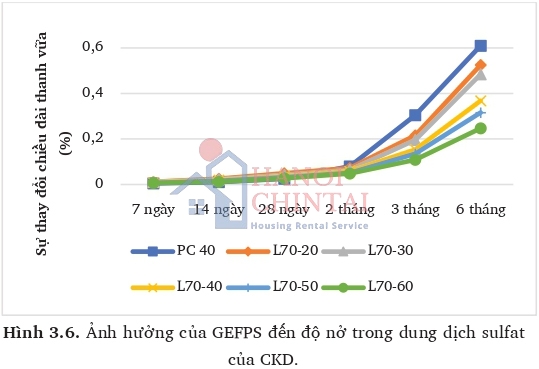 Từ kết quả thí nghiệm cho thấy, độ nở của thanh vữa tăng lên theo thời gian ngâm mẫu với tất cả các mẫu CKD thử nghiệm. Độ nở thanh vữa có xu hướng giảm khi tăng hàm lượng GEFPS, mức độ giảm tùy vào thời gian đo. Khi so sánh với mẫu đối chứng, ở các tuổi ngắn ngày độ nở của các mẫu CKD chứa xỉ lớn hơn, tuy nhiên ở tuổi dài ngày lại có xu hướng giảm, thậm chí ở tương đối đáng kể. Nguyên nhân do khi CKD làm việc trong môi trường sun phát, các muối sun phát có khả năng phản ứng với các khoáng thủy hóa chứa nhôm của xi măng tạo nên các khoáng ettrigite gây nở thể thích hoặc bản thân các ion sun phát phản ứng với ion Ca²+ trong đá xi măng tạo thạch cao cũng gây nở thể tích. Các quá trình này đều tạo ra các khoáng gây nở thể tích làm nguyên nhân gây hiện tượng nứt, ăn mòn dẫn đến suy giảm cường độ của CKD. Ở tuổi ngắn ngày, các sản phẩm thủy hóa của mẫu xỉ được hình thành rất ít, dẫn đến độ đặc chắc kém, nên SO4²- giễ giàng xâm nhập gây ra hiện tường nở lớn hơn so với mẫu đối chứng. Tuy nhiên, ở các tuổi dài ngày, khi sản phẩm thủy hóa đã hầu như được hình thành hết, dẫn đến mẫu có độ đặc chắc lớn hơn, từ đó giảm được sự xâm phâm SO4²- và giảm được đo nở trong mẫu.
