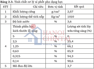 Các nghiên cứu được tiến hành trên loại xỉ phốt pho của Công ty Cổ phần Hóa chất Đức Giang với 3 độ mịn khác nhau là 3.617 cm²/g, 4.584 cm²/g và 5.675 cm²/g tương đương với loại L70, L85 và L95 theo phân loại của tiêu chuẩn GB/T 26751. Các tính chất của xỉ được trình bày tại Bảng 2.3 và Bảng 2.4.