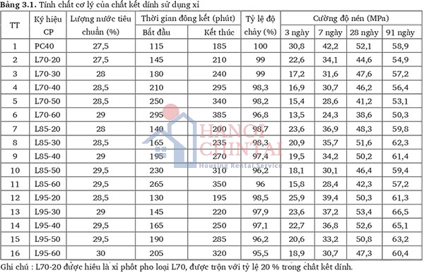 Nghiên cứu ảnh hưởng của xỉ phốt pho đến tính chất xi măng được trình bày trong Bảng 3.1.