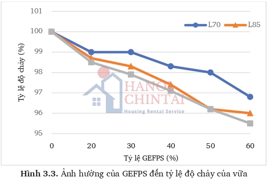 Kết quả xác định tỷ lệ độ chảy của mẫu vữa sử dụng xỉ GEFPS cho thấy rằng, các mẫu vữa sử dụng xỉ nghiền đều có độ chảy thấp hơn so với mẫu vữa đối chứng và tỷ lệ nghịch với hàm lượng xỉ có trong chất kết dính, tỷ lệ độ chảy giảm hơn so với mẫu đối chứng dao động trong khoảng từ 0 - 4,5%. Điều này giải thích do tăng thể tích lượng hồ chất kết dính do khối lượng riêng của xỉ thấp hơn so với xi măng. Khi so sánh với tiêu chuẩn GB/T 26751:2011 “Ground granulated electrirc furnace phosphours slag powder used for cement and concrete” về chỉ tiêu tỷ lệ độ chảy, tất cả các mẫu vữa sử dụng xỉ GEFPS đều thõa mãn yêu cầu kỹ với tỷ lệ độ chảy không bé hơn 95% so với mẫu vữa đối chứng.