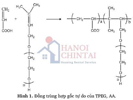 Độ trùng hợp và thành phần các nhóm chức của PCE có thể được thiết lập bằng cách chọn tỷ lệ mol thích hợp của TPEG hoặc HPEG với AA. Các điều kiện thời gian phản ứng, nhiệt độ phản ứng, tốc độ khuấy cũng được khảo sát. phản ứng tổng hợp, đồng trùng hợp gốc tự do giữa TPEG và AA được trình bày trong Hình 1.