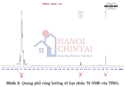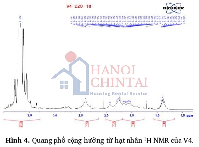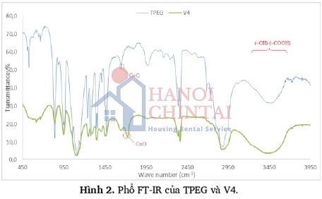 Đã thực hiện phân tích phổ hồng ngoại FT-IR và quang phổ cộng hưởng từ hạt nhân 1H NMR mẫu TPEG ban đầu và mẫu phụ gia PCE sau phản ứng trùng hợp (mẫu V4 có tỷ lệ trùng hợp giữa TPEG:AA = 1:3,5 ở điều kiện nhiệt độ 50°C trong 3 giờ và tốc độ khuấy là 400 vòng/phút) để xem xét sự thay đổi cấu trúc trong phân tử. Phổ FT-IR của TPEG và V4 được phân tích ở vùng cơ bản 400 - 4.000 cm-1. Kết quả phân tích hình ảnh qua phổ hồng ngoại FT-IR và quang phổ cộng hưởng từ hạt nhân 1H NMR của mẫu TPEG và mẫu V4 được thể hiện trên các Hình 2; Hình 3; Hình 4.