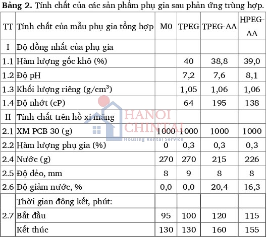 Sau khi nghiên cứu một số tài liệu tham khảo [12;13] và khảo sát sơ bộ, đã lựa chọn hai loại macromonomer là TPEG và HPEG để tiến hành thử nghiệm tổng hợp phụ gia PCE. phản ứng tổng hợp phụ gia được thực hiện ở nhiệt độ 40°C; tốc độ khuấy 200 vòng/phút; thời gian khuấy là 2 giờ cùng với tỷ lệ các hóa chất (TPEG; HPEG):AA = 1:2,5 (theo tỷ lệ mol). APS được thêm vào với hàm lượng 1,5 mmol/lít nhằm mục đích khơi mào cho phản ứng trùng hợp. Kết quả thử nghiệm so sánh tính chất của các sản phẩm phụ gia trùng hợp và dung dịch TPEG không tham gia phản ứng trùng hợp được nêu trong Bảng 2.
