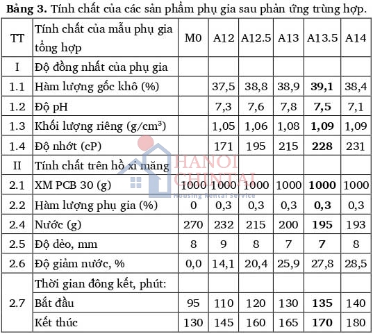 Để lựa chọn tỷ lệ chất trùng hợp AA cho phản ứng tổng hợp phụ gia, đã khảo sát tỷ lệ (TPEG:AA) lần lượt là (1:2), (1:2,5), (1:3), (1:3,5), (1:4) (theo tỷ lệ mol), APS 1,5 mmol/lít, ở nhiệt độ 40°C; tốc độ khuấy 200 vòng/phút; thời gian khuấy là 2 giờ. Kết quả thử nghiệm tính chất của các sản phẩm phụ gia trùng hợp được nêu trong Bảng 3.
