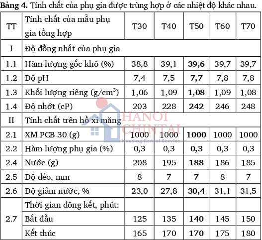 Từ kết quả nhận được trong Bảng 4 nhận thấy, khi thay đổi nhiệt độ phản ứng thì phụ gia trùng hợp có sự thay đổi đáng kể ở một số tính chất: khi nhiệt độ trùng hợp tăng thì độ nhớt và độ giảm nước khi trộn với xi măng của phụ gia tăng dần, thời gian đông kết của mẫu xi măng có xu hướng tăng chậm. Điều này chứng tỏ khi tăng nhiệt độ thì khả năng trùng hợp của TPEG và AA tăng lên, điều này là hoàn toàn phù hợp khi APS là hợp chất có tác dụng khơi mào phản ứng chỉ phân tách thành gốc tự do khi có tác dụng của nhiệt độ, vì vậy khi tăng nhiệt độ thì phản ứng trùng hợp sẽ diên ra dê dàng hơn, tuy nhiên khi nhiệt độ phản ứng cao hơn 50°C thì sự gia tăng các tính chất của mâu phụ gia là không đáng kể. Do đó, đã lựa chọn nhiệt độ phản ứng là 50°C để tiếp tục tiến hành các nghiên cứu tiếp theo.