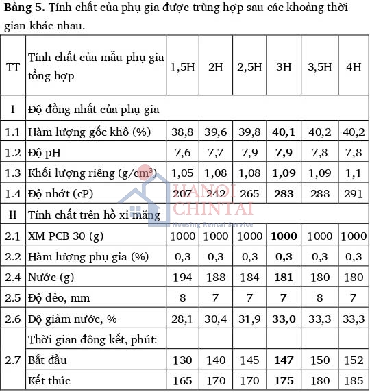 Phản ứng trùng hợp TPEG với AA theo tỷ lệ (1:3,5), APS 1,5 mmol/lít, ở nhiệt độ 50°C trong các khoảng thời gian 1,5; 2; 2,5; 3; 3,5; 4 giờ với tốc độ khuấy 200 vòng/phút. Kết quả thử nghiệm tính chất của các sản phẩm phụ gia trùng hợp được trình bày trong Bảng 5.