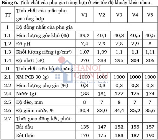 Kết quả nhận được trong Bảng 6 cho thấy, khi tốc độ khuấy tăng thì độ nhớt và độ giảm nước khi trộn với xi măng của phụ gia trùng hợp tăng dần, thời gian đông kết của mẫu xi măng cũng có xu hướng tăng chậm. Điều này chứng tỏ tốc độ khuấy đã ảnh hưởng tới độ trùng hợp. Khi tăng tốc độ khuấy thì các tính chất đều tăng lên, tuy nhiên khi tốc độ khuấy cao hơn 400 vòng/phút thì sự gia tăng các tính chất của mẫu phụ gia là không đáng kể chứng tỏ khả năng trùng hợp của sản phẩm đã gần đạt đến mức tới hạn. Do đó, đã lựa chọn tốc độ khuấy cho phản ứng trùng hợp là 400 vòng/phút để chế tạo phụ gia PCE.