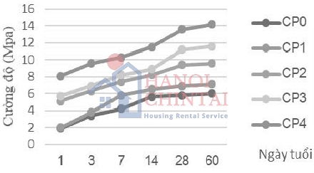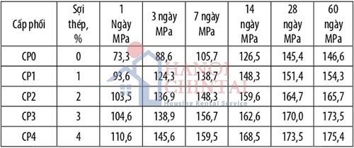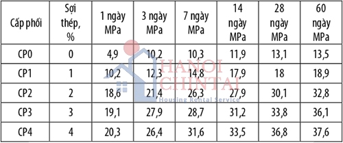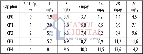 Bảng 4. Ảnh hưởng của hàm lượng sợi thép đến cường độ kéo tại theo thời gian