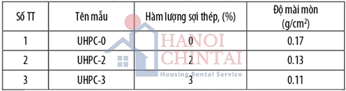 Các kết quả thử nghiên cứu độ mài mòn của UHPC với các hàm lượng sợi thép khác nhau được trình bày trong Bảng 6 dưới dây.