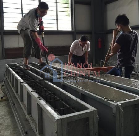 Kích thước hình học dầm thí nghiệm: Rộng 200mm, cao 300mm, dài 3300mm với 2 loại đường kính thép được sử dụng, chia làm 02 tổ mẫu thí nghiệm. Sau đó, nhóm sẽ tiến hành đúc dầm.