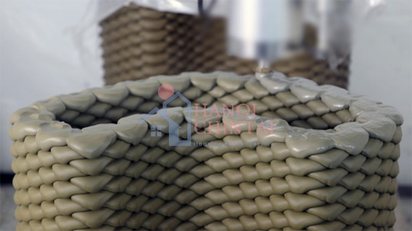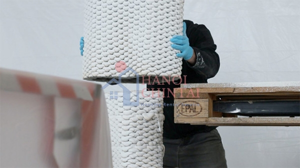 Các lõi rỗng sẽ được gắn kết và xếp chồng lên nhau. Sau đó, lõi rỗng sẽ được tiếp tục được lấp đầy bằng bọt xốp không xi măng.