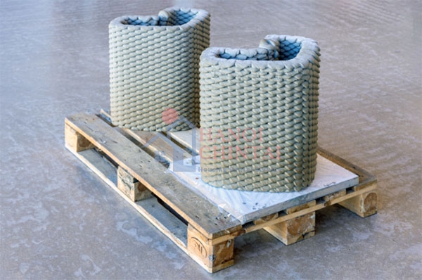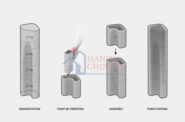 Các phần ghép lõi rỗng trước tiên sẽ được tạo hình bằng phương pháp in 3D bằng chất liệu xốp không xi măng.