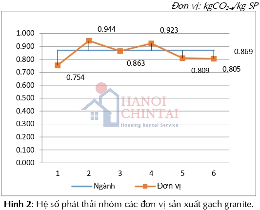 Gạch granite: Hệ số phát thải trung bình cho nhóm các đơn vị sản xuất gạch ốp lát granite là 0,869 kgCO₂-e/kg SP. Trong đó, giá trị hệ số phát thải thấp nhất là 0,754 kgCO₂-e/kg SP và cao nhất là 0,944 kgCO₂-e/kg SP như được thể hiện trong Hình 2.