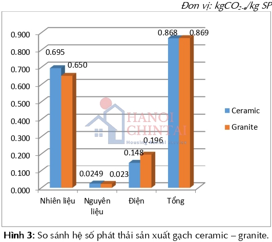 Hình 3 cho thấy, hệ số phát thải tổng cho quá trình sản xuất gạch ceramic cao hơn so với sản xuất gạch granite là không đáng kể, có thể gọi là tương đương, giá trị chênh lệch ước tính khoảng 0,001 kgCO₂-e/kg SP. Phát thải từ tiêu thụ nhiệt năng và điện năng là yếu tố quyết định sự khác biệt giữa quá trình sản xuất hai loại hình sản phẩm này. Nếu bỏ qua phát thải gián tiếp từ quá trình sử dụng điện năng, chỉ tính phát thải từ nhiên liệu và nguyên liệu thì hệ thấy rõ quá trình sản xuất ceramic lớn hơn nhiều so với sản xuất gạch granite. Hệ số phát thải không tính điện cho hoạt động sản xuất gạch ceramic là 0,720 kgCO₂-e/kg SP trong khi đó đối với sản xuất gạch granite chỉ là 0,673 kgCO₂-e/kg SP. Khoảng chênh lệch giữa hai sản phẩm lên tới 0,047 kgCO₂-e/kg SP.