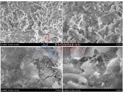 Mẫu vữa PCB 4 sau 28 ngày có cường độ nén thỏa mãn tiêu chuẩn xi măng PCB 40. Sau khi đo cường độ nén 28 ngày, ta lấy mẫu đem chụp SEM với các độ phóng đại khác nhau 2.000, 5.000, 10.000, 15.000 lần để quan sát cấu trúc hình thành và phát triển bên trong ở các độ phóng đại khác nhau.
