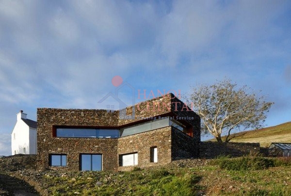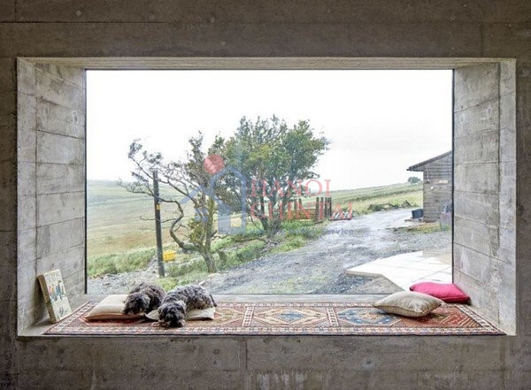 Cuối cùng, đá sa thạch đã được lựa chọn để tạo ra các bức tường dày giúp cách nhiệt giữa bên trong và bên ngoài nhà. Cửa sổ bằng kính lớn được bố trí dọc theo chiều dài ngôi nhà, cung cấp tầm nhìn ra bên ngoài theo nhiều góc độ khác nhau mà không bị cản trở.