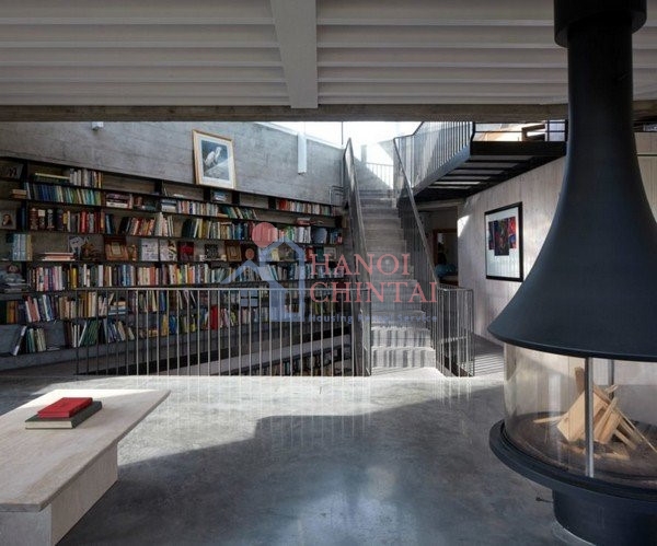 Tại trung tâm của ngôi nhà là một cầu thang lớn, được làm từ các tấm kim loại đục lỗ, trải dài qua ba tầng của ngôi nhà.