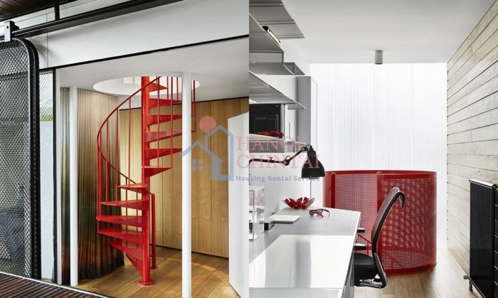 Bên trong ngôi nhà được bố trí cầu thang dạng xoắn, màu đỏ nổi bật.