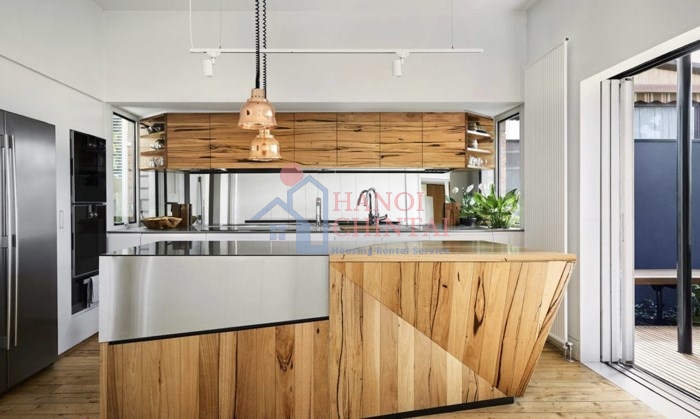 Gỗ tái chế được sử dụng làm không gian nhà bếp.