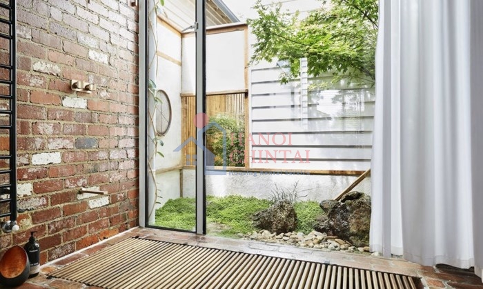 Gạch đỏ được lấy từ những khu nhà được phá dỡ, tận dụng để xây nhà tắm. Ngôi nhà cũng tận dụng những khung cửa kính lớn để lấy nguồn ánh sáng tự nhiên.