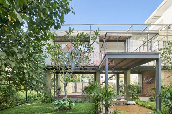 Ngôi nhà có kết cấu đặc biệt với tầng một chỉ có các trụ cọc, không tường bao, hoàn toàn thông mở với khu vườn, tầng hai là các phòng chức năng được xây dựng đơn giản từ khung thép và tấm vật liệu nhân tạo.