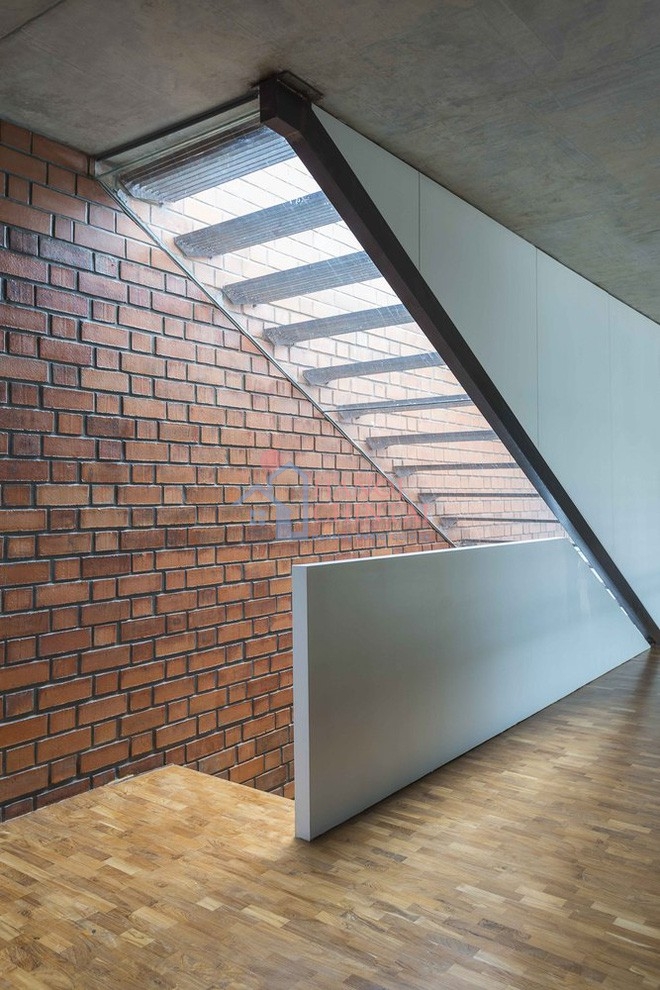 Không chỉ có cách tổ chức không gian làm nổi bật lên ý tưởng thiết kế của KTS, vật liệu sử dụng trong toàn bộ công trình cũng thể hiện được sự tinh tế của người làm kiến trúc. Đó là giao thoa giữa những nguyên vật liệu hiện đại như thép nhẹ, bê tông cốt thép, kính với những vật liệu truyền thống như gạch nung và gỗ.