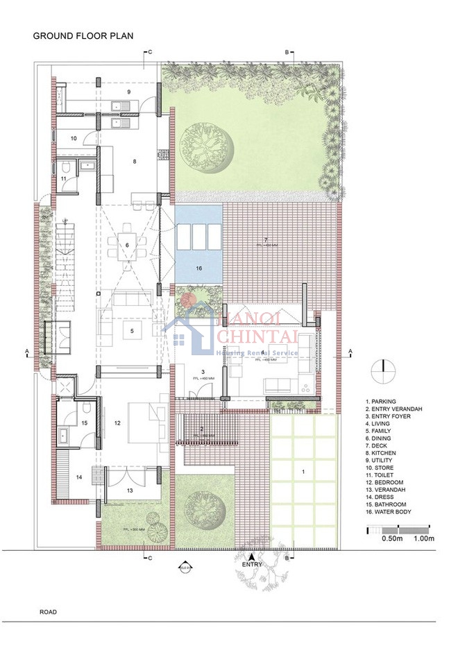 Ý tưởng đầu tiên là đặt cạnh ngắn của ngôi nhà hình chữ L theo trục Đông Tây. Đây cũng chính là trục mặt tiền tiếp giáp với tuyến đường chính. Cạnh dài của ngôi nhà và không gian sinh hoạt đặt theo phương Bắc Nam. Cách bố trí này giúp các căn phòng được đón gió và trở nên mát mẻ, tránh ánh sáng mặt trời trực tiếp từ hướng Tây.
