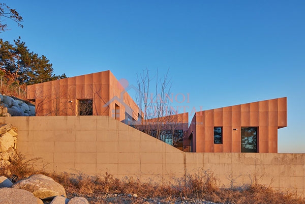 Lớp bê tông ốp gợn sóng mượt mà mượn gam màu từ đất đai xung quanh và tạo hiệu ứng như phát sáng dưới ánh mặt trởi mọc. Những bức tường góc cạnh chạy dọc theo viền của khu đất, còn các mái dốc nghiêng theo hướng ngược lại. Các mái nhà là cách giải quyết cả mong muốn tối đa hóa tầm nhìn ra biển và phản ứng kỹ thuật đối với lượng mưa cao tại nơi này mùa bão, Ahn nói.