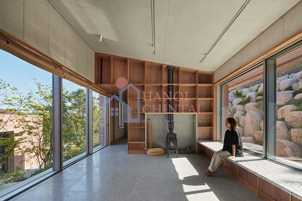 Trong không gian này, công ty thiết kế tạo ra một không gian ấm cúng bằng ván sồi lauran, một loại gỗ châu Á thường được sử dụng trong kiến trúc Hàn Quốc. Vật liệu này cũng được sử dụng cho nội thất bếp, cũng như một băng ghế hình chữ L được đặt ở một góc phòng. Một cầu thang bọc ván sồi dẫn lên không gian cao hơn, nơi bố trí một phòng ngủ có nhà vệ sinh riêng và phòng thay quần áo.