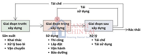 Tác động của mọi bước trong quy trình sản xuất từ thu thập nguyên liệu thô, sản xuất, phân phối và lắp đặt đến hoàn thành sử dụng và thải bỏ đều được kiểm tra. Do đó, vòng đời của vật liệu có thể được chia thành ba giai đoạn (Hình 1): - Tiền xây dựng - Xây dựng - Hậu xây dựng [10].