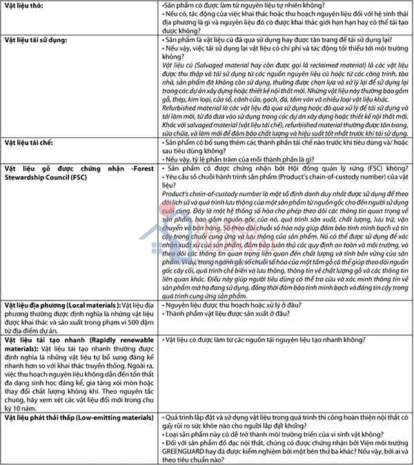 Bảng 1: Tiêu chí và những câu hỏi gợi ý giúp nhà thiết kế nội thất có thể lựa chọn được vật liệu phù hợp với mục tiêu thiết kế bền vững [10]